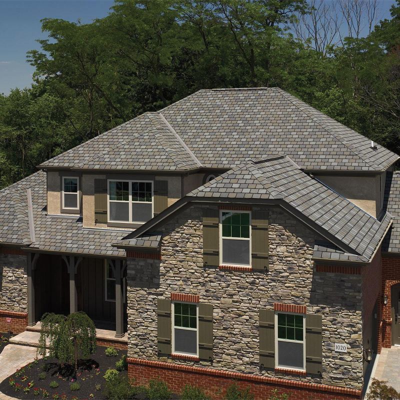 Каждый лепесток гонта имеет свой индивидуальный оттенок, а общий вид кровли смотрится благородно и лаконично. Такой вид натуральная сланцевая кровля приобретает лишь по прошествии нескольких лет.