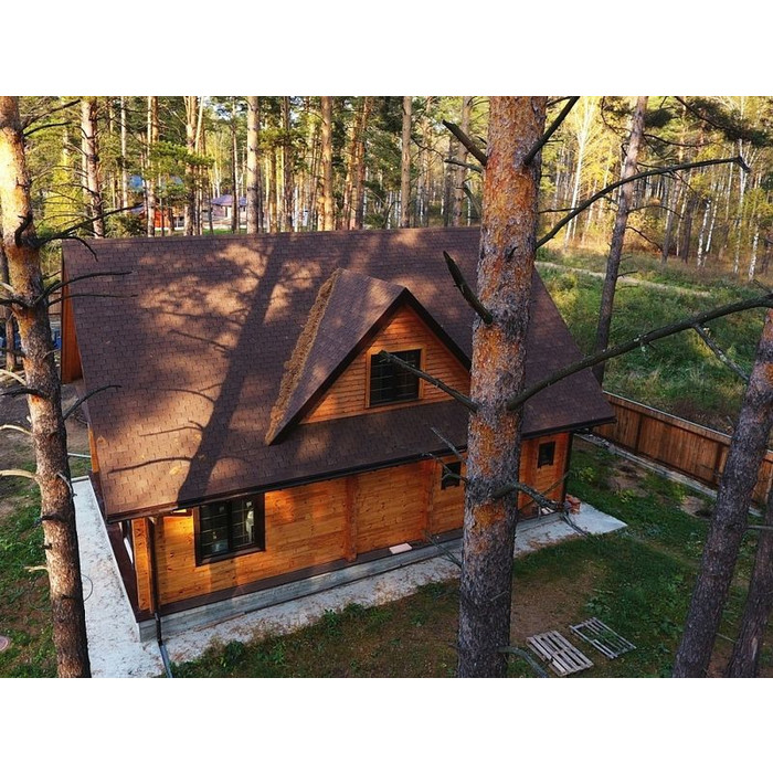 Натуральные коричневые оттенки черепицы хорошо сочетаются с фасадами в сливочных и светло-зеленых тонах. Лепестки лаконичной формы не отвлекают внимание от деталей кровли. Благородный матовый блеск гранулята подчеркивает класс материала.