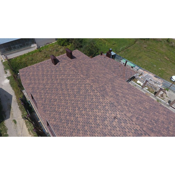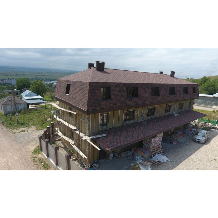 Черепица выполнена в приглушенных кофейных оттенках. Нестандартная форма лепестков гонтов эффектно подчеркнута реалистичным эффектом тени. Кровля гармонично смотрится с фасадами в светлых оттенках, под натуральный брус, камень и клинкерный кирпич.