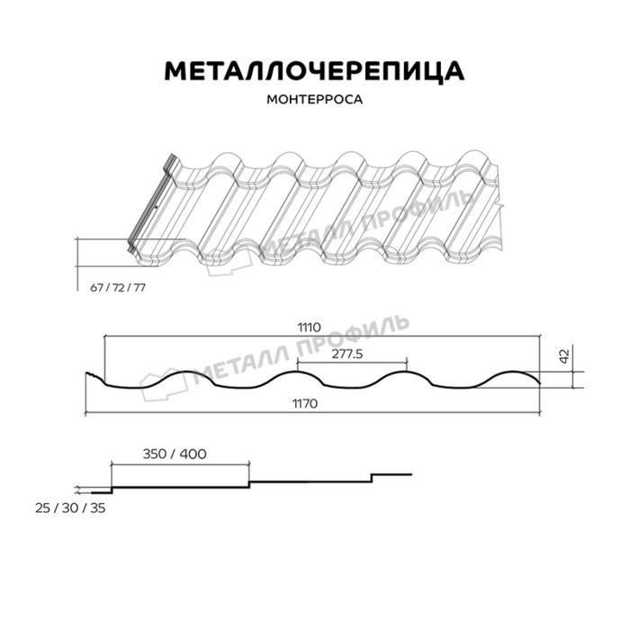 В 2018 году компания «Металл Профиль» вывела на рынок новинку. Высота этого профиля достигает 77 мм. В совокупности с технологией горизонтального 3D-реза он подчёркивает сходство с глиняной черепицей. Совмещая различные ступеньки, вы сможете подобрать для себя оригинальный вариант, который подарит вашему дому неповторимый внешний вид. Отметим, что на крупных скатах кровли удачнее будут смотреться более объёмные секции профиля Монтерроса®. Для лучшей герметичности стыков мы оптимизировали вид бокового замка. Его небольшая ширина увеличивает используемую площадь листа. Металлочерепица Монтерроса® произведена на современном оборудовании, что обеспечивает высокое качество продукции.