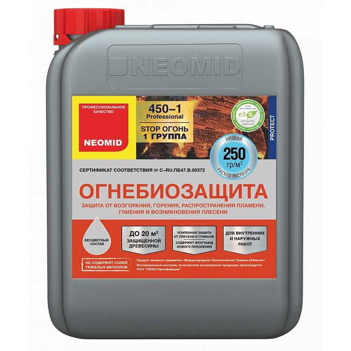 Неомид 450-1 – высокоэффективное средство для огнезащиты и антисептирования древесины для наружных и внутренних работ в условиях, исключающих вымывание состава с обработанной поверхности. Переводит древесину в трудновоспламеняемый и трудногорючий материал, обеспечивая I (первую) группу огнезащитной эффективности по ГОСТ Р 53292-2009, защищает от гниения, возникновения плесени.