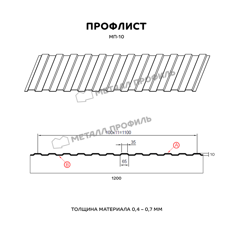 МП-10 – вариант типичного стенового профнастила. Он замечательно смотрится в виде забора, подвесного потолка в нежилых зданиях, стенового материала, декоративного ограждения, вентилируемого фасада. Профлист характеризуется трапециевидной формой гребня, идентичной на сторонах А и В. Высота волны – 10 мм, это не даёт металлопрокату высокой несущей способности, но при оформлении стен это не столь важно. Но зато спокойный рельеф профилированного листа не создаёт строению суровый облик. На технические свойства можно повлиять, заказав ту или иную толщину металла. Этот профиль прокатывается в версиях от 0,4 до 0,7 мм. Усилить антикоррозионную защиту способен декоративный полимерный слой. Покрытие не только отличается богатым цветом, устойчивым к выгоранию под УФ-лучами, но и предупредит небольшие физические дефекты и корродирование стальной основы.