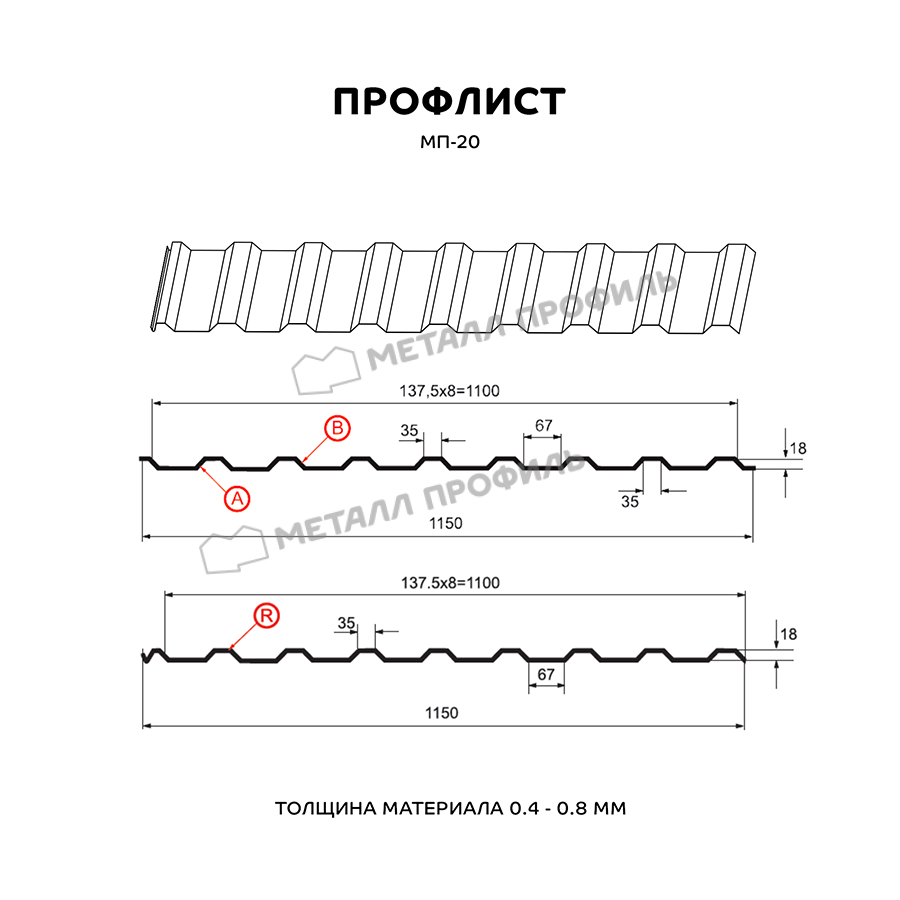Профнастил МП-20 относится к универсальным cтройматериалам. В отличие от многих других видов профлиста, он изготавливается в трёх версиях: А, В и R. Типы А и В применяются для кровельных работ, облицовки стен, возведения ограждений, для внутренней отделки складских помещений, гаражей, ангаров и т.п. Профиль МП-20 с маркировкой R отличается присутствием капиллярной канавки и предназначен в качестве кровельного покрытия. В зависимости от зоны применения, МП-20 изготавливается из оцинкованной стали толщиной от 0,4 до 0,8 мм. Обратите внимание: хоть в названии указана цифра 20, реальная высота этого профиля – 18 мм. Это материал бюджетной ценовой категории и обладает доступной ценой. МП-20 – прочный и качественный стройматериал, преимущества которого по достоинству оценивают не только частные лица, но и крупные застройщики. Он обладает приличной жёсткостью, выдерживает значительные статические нагрузки и эффективно противостоит нагрузкам динамическим.