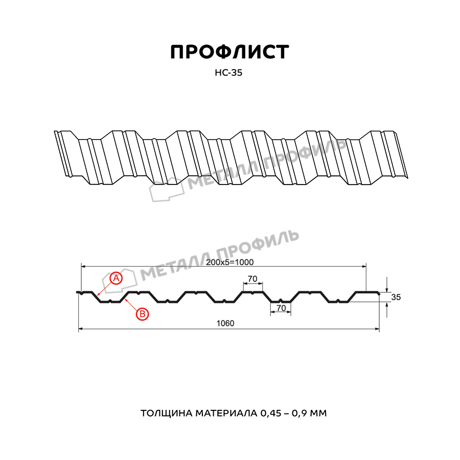 Универсальный и практичный материал с одинаковым с обеих сторон профилем. Пометка НС означает, что профилированный лист является и «несущим», и «стеновым». Он пользуется спросом как для гражданского строительства, так и для промышленных объектов. С помощью профлиста с высотой волны в 35 мм создаются конструкции очень разного назначения: ограждения придомовых и городских территорий, обустройство кровли, быстровозводимые постройки ( павильоны, навесы ), каркасные здания ( склады, торговые центры, цеха ). Хорошую способность выдерживать нагрузки НС-35 придают добавочные рёбра жёсткости, проходящие на лицевой и внутренней сторонах профлиста. Рабочая ширина этого профиля составляет 1000 мм при номинальной ширине 1060 мм, то есть при монтаже данного металлопрофиля в боковой замок уйдёт 60 мм. Толщина металла имеет диапазон от 0,5 до 0,9 мм – это обуславливает не только механическую прочность профлиста, но и его тяжесть. Полимерный слой из каталога Компани Металл Профиль добавит материалу дополнительную стойкость к ржавению и УФ-излучению.